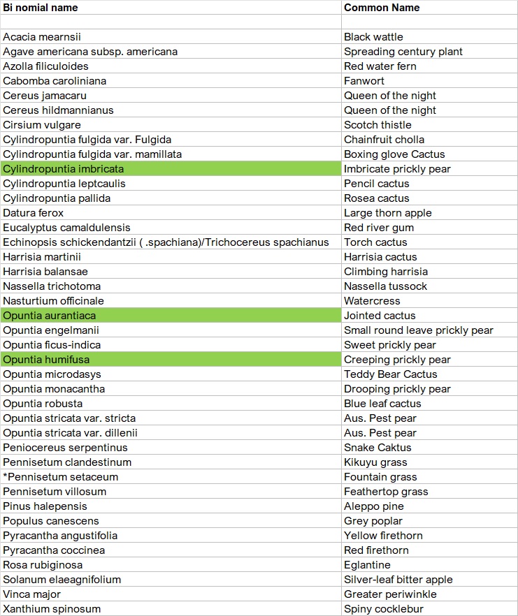 The following list highlights some of the more common exotic and invasive plant species recorded within the Protected Environment. Please note that this list is not exhaustive, and additional species may occur across the landscape.
